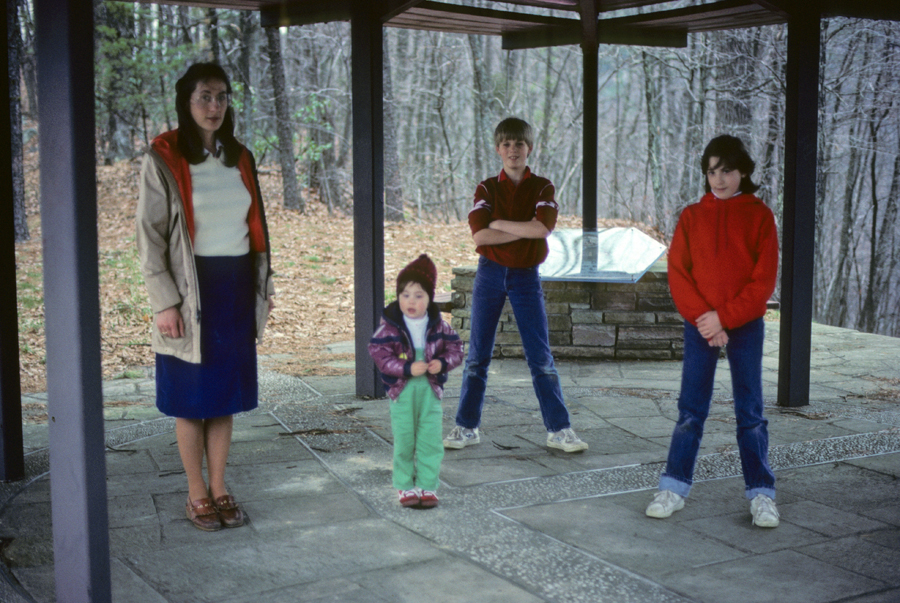 Kate is standing on the tri-state point in this photo from 1984, which was a short hike from Rt 25E when it ran directly through the Gap. In 1996 a tunnel was completed to bypass the Gap and the Gap was returned to a walking path – the original Wilderness Road.