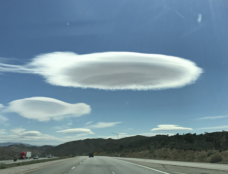 4/19 Tu – Dropped Helen off at the Burbank airport for her flight home and started my drive to UT. Found this flying saucer cloud outside of Las Vegas. Don’t text and drive – note, I am in the middle lane with no one around me!