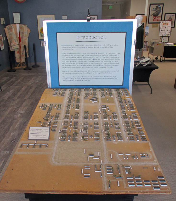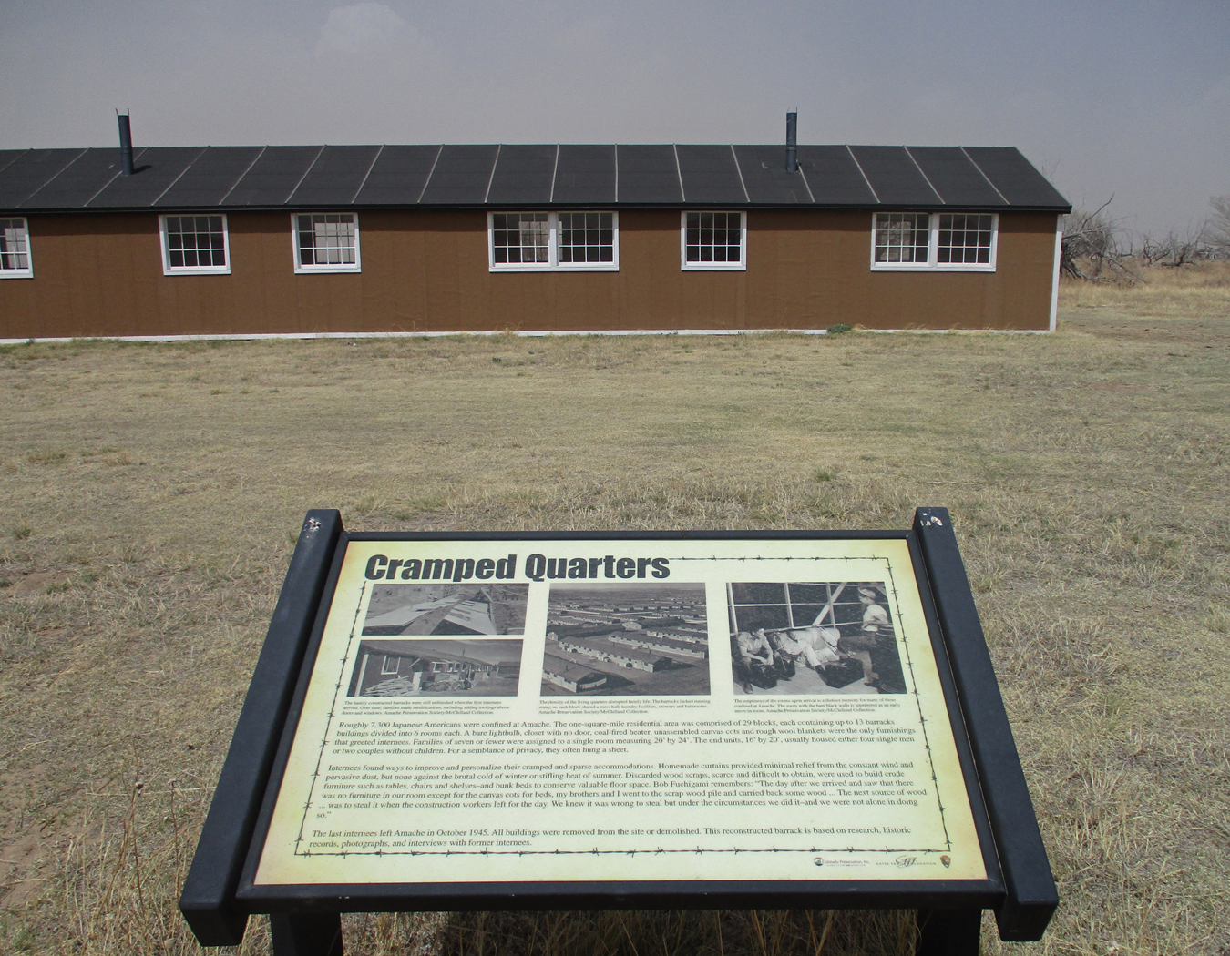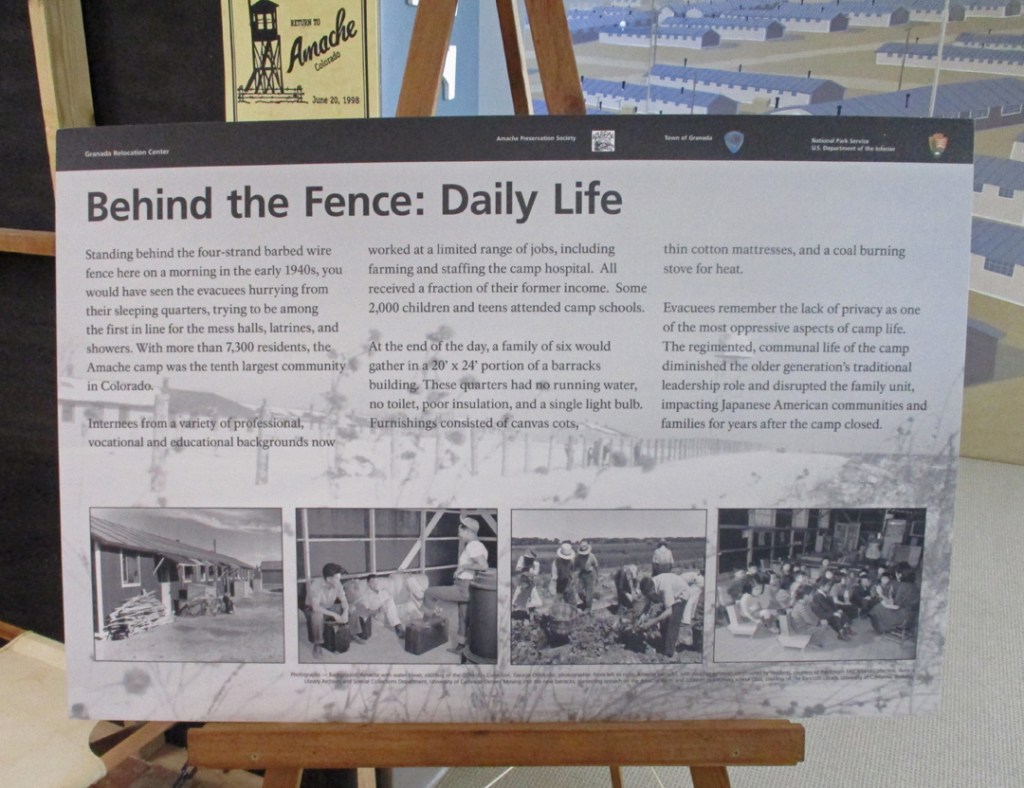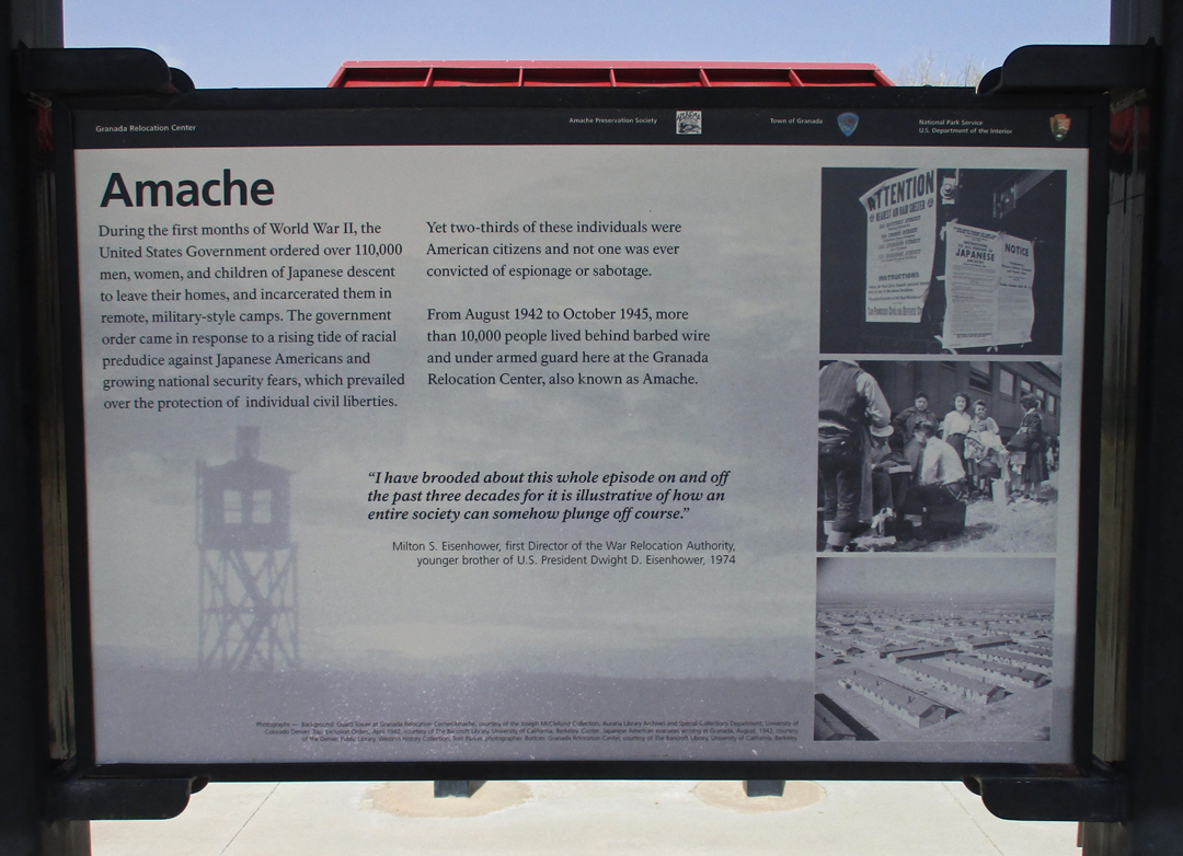Granada Relocation Center, also known as Amache, was one of ten Japanese internment camps operated by the U.S. government during World War II (1943-1945). At its peak, it housed 7,500 persons of Japanese descent, most American citizens. In retrospect, this was a black mark on the Roosevelt administration. Japanese arriving by rail car – does that remind you of anything?