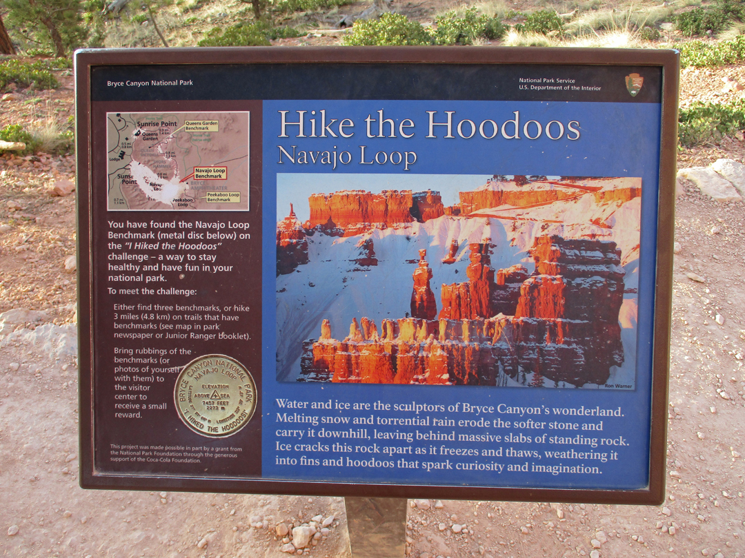 I decided to do the “Hike the Hoodoos” challenge. There are nine benchmarks located along eight different hiking trails in the park. A minimum of three miles of hiking is needed to get an “award.” In order to “prove” you completed this task, you need to take photos or rubbings of three of the nine medallion benchmarks. I started with a hike to Mossy Cave, which is off Rt 12 in the northern part of the park.
