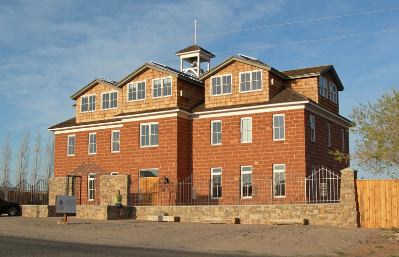 Old Museum in Granada foreground, new Museum and Amache NHS Visitor Center background with green awning