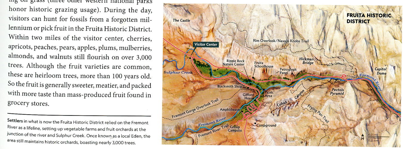 Map showing Fruita locations as well as the Rim Overlook and Hickman Bridge Trails