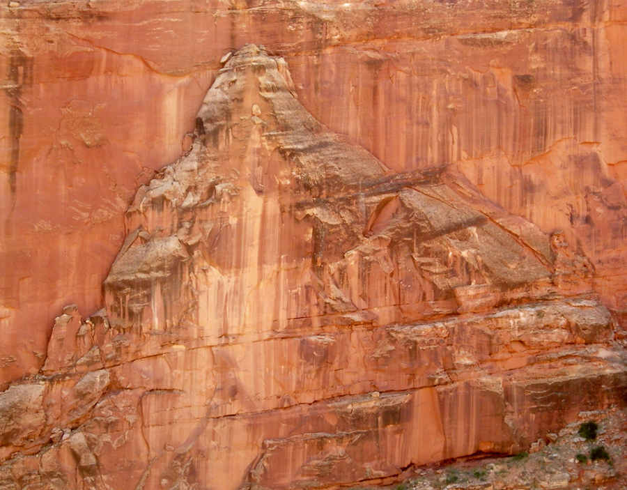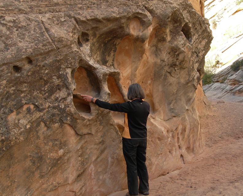On the way up we passed an outlook for Hickman Natural Bridge but couldn’t see it. On the way back we met some other hikers who said we had to look harder – it was there. Well, I tried and still couldn’t see it – then Helen said, “There it is.” We were standing on a cliff right across from it but because it had a rock background from our high vantage point, we at first were unable to pick it out! The following photos are from our 2-mile hike to the Hickman Bridge. You can “see” the Bridge in these two photos.