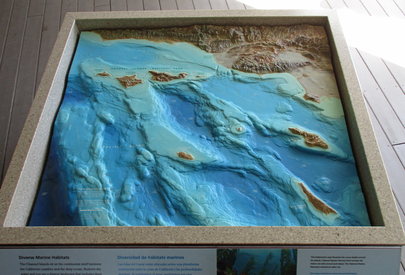 Nice model showing the eight Channel Islands. The islands were never part of the mainland – they are the easternmost islands in the Pacific Island group. “Today, five of the islands (San Miguel, Santa Rosa, Santa Cruz, Anacapa, and Santa Barbara), their submerged lands, and the waters within one nautical mile of each island are protected as Channel Islands National Park.” The Channel Islands National Marine Sanctuary extends six miles from the shore of each island. This land/water area is “. . . home to over 2,000 species of animals and plants – 145 are found nowhere else on Earth.”
