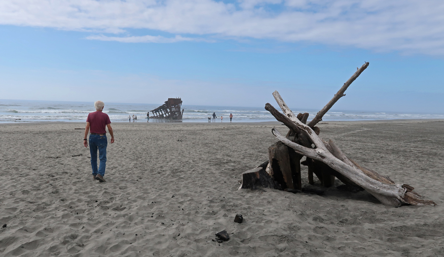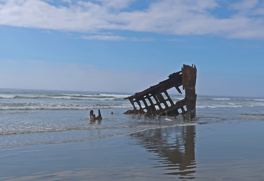 According to Wikipedia, “The Peter Iredale was a four-masted steel bark built in Maryport, England, in 1890 . . . On September 26, 1906, the Iredale left Salina Cruz, Mexico, bound for Portland, where it was to pick up a cargo of wheat for the United Kingdom.” While waiting for a pilot to enter the Columbia River, a heavy wind and strong current caused the ship to run aground.
