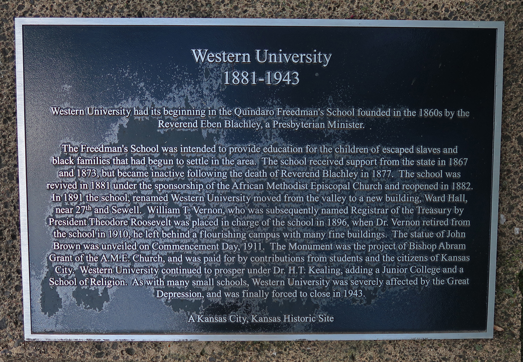 Quindaro Freedman’s School was started here in 1860. The school closed in 1877 but was re-activated by the African Methodist Episcopal Church (AME) in 1882. In 1891 it was renamed Western University and continued to educate primarily blacks until it was forced to close in 1943.