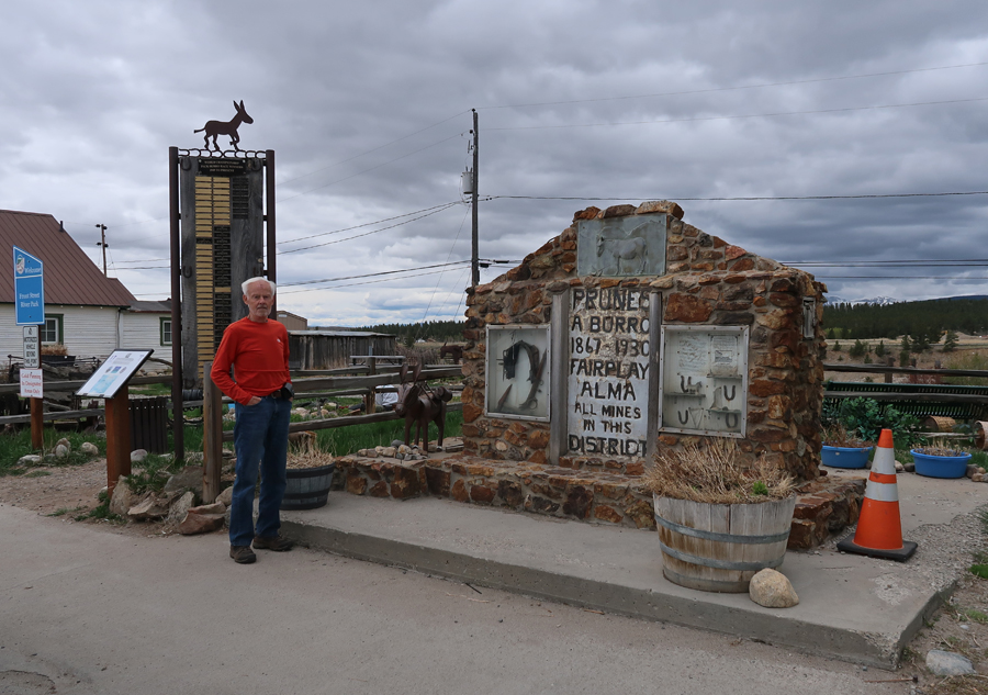Monument to Prunes A Burro 1867–1930, Fairplay, Alma, All Mines in this District. The monument is adorned with mining tools, ore samples, and a winner’s board for the World Championship Pack-Burro Race that started here in 1949. Burros were used to help miners carry gold ore. They were used to carry anything heavy and could be trusted to navigate narrow trails without dropping valuable loads. Before freight wagons could navigate these trails, burros carried millions of dollars worth of ore out of the Colorado mountains. Many miners bonded with these animals but Prunes in particular became a Park County legend. He worked at almost every local mine during that period. The last mine he was said to work at was the Hocking Mine in Mosquito Gulch.