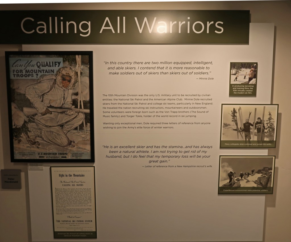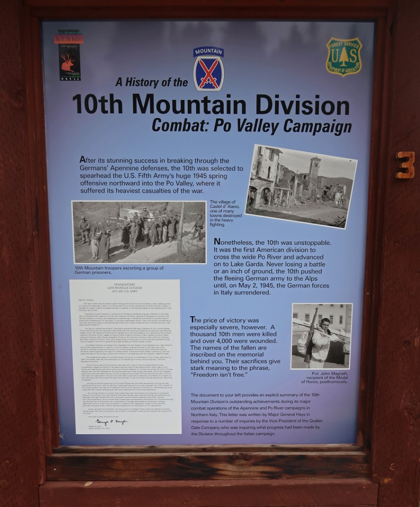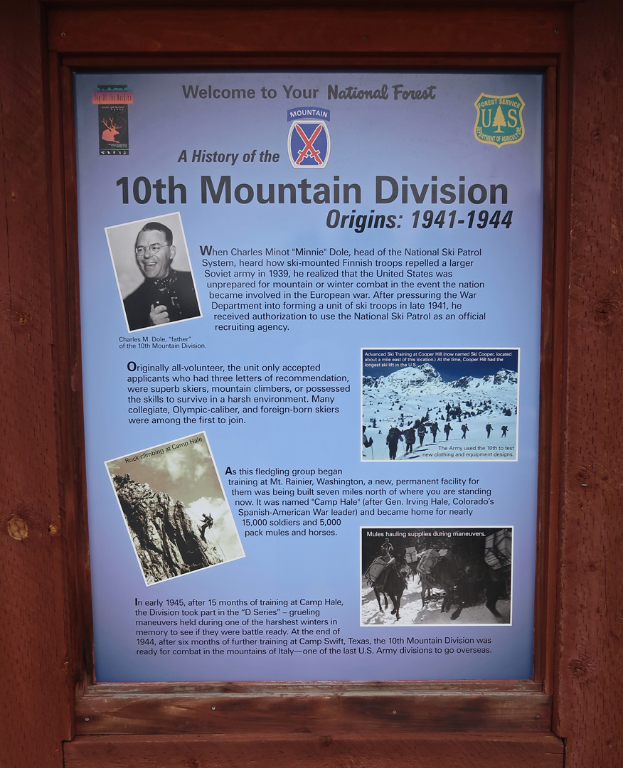 The Colorado Snowsports Museum and Hall of Fame is in Vail. It has a major display on the 10th Mountain Division and Camp Hale.