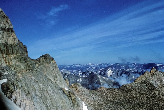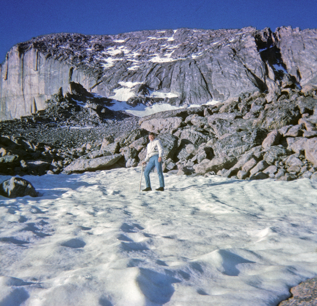 We did the climb up by way of the “Cables Route.” View of Chasm Lake from edge of East Face in 1966 when I climbed to this point by myself. Note the basketball shoes, novice climber! The cables were removed by the NP in 1973.