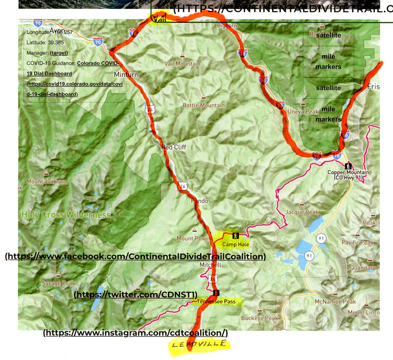 Walked a short distance on the Continental Divide National Scenic Trail (CDT). The CDT extends 3,028-miles from Canada to Mexico and is considered one of the greatest long-distance trails in the world. The CDT is one-third of the “Triple Crown of Hiking.” That is, the CDT, Appalachian Trail (AT) 2,194-miles, and the Pacific Crest Trail (PCT), 2,653-miles. The CDT is in Red on this map [our driving route in orange] –