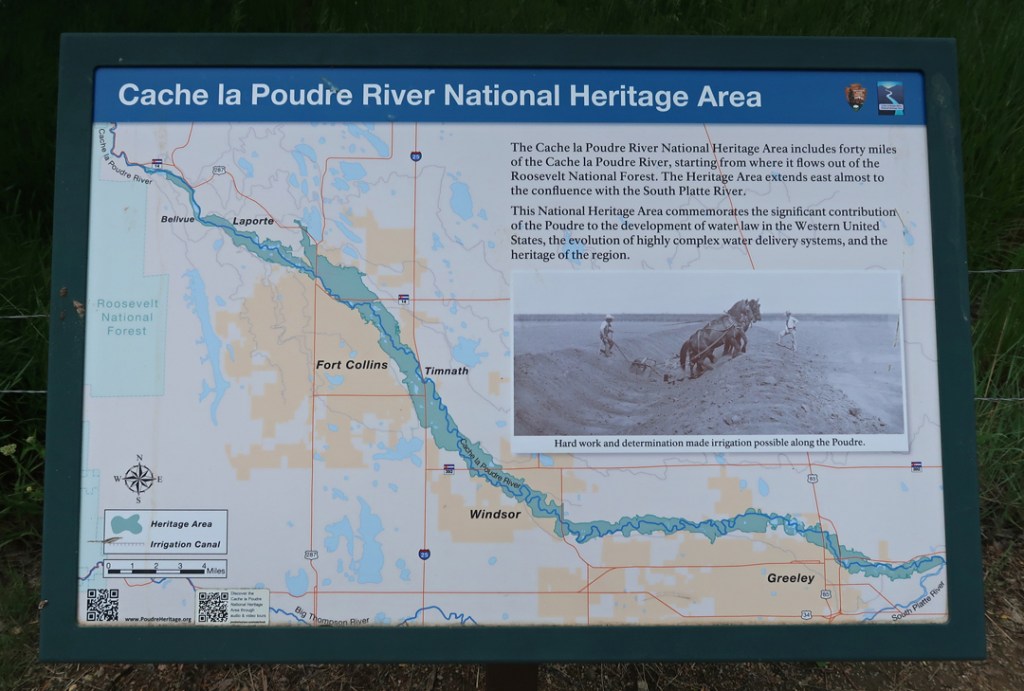 It took about two hours to drive from the Alpine Visitor Center to Cache la Poudre River National Heritage Area (NHA). The NHA follows the river from Roosevelt National Forest to where it empties into the South Platte River. It is Colorado’s only Wild & Scenic River.