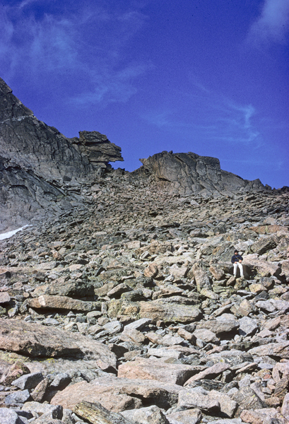The next day when we got to the Boulderfield (12,660ft), Pat had altitude sickness. So, I stayed with him while Helen, Joe, and Mike did the climb by way of the Keyhole Route. John Wesley Powell was the first to climb this peak in 1868. This climb was 100 years later!