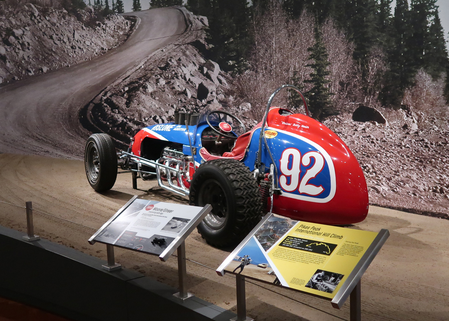 Two other cars at the museum caught my attention. The first was a Moore/Unser racecar used on the Pikes Peak International Hill Climb in 1958. The Pikes Peak Hill Climb was started in 1915, one year after the toll road was completed. It is run on the last Sunday of June each year. The 2011 “Hill Climb” was the last year when some of the route was not paved. In 2018, a VW I.D.R. electric racecar set a record of 7 minutes 57.128 seconds for the 12.42-mile course, with an elevation gain of 4,720ft and 156 turns! One reason why Electric cars have an advantage is because the gasoline engines require oxygen, which decreases with altitude.