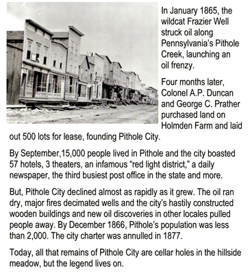 Oil City is where Oil Creek enters the Allegheny River – it was a major center for transportation of oil.