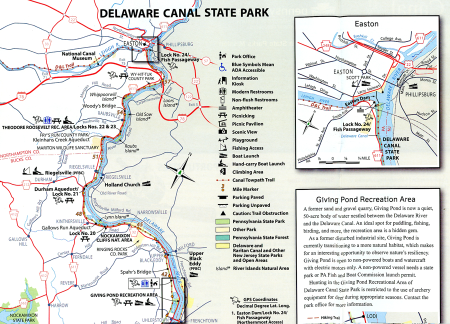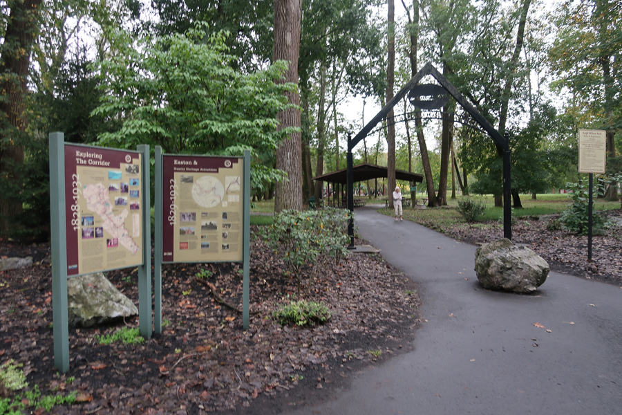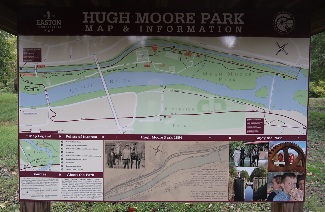 3.5hrs (180mi) from NE NST to Easton PA, where the Lehigh River enters the Delaware River. The Delaware and Lehigh (D & L) National Heritage Corridor Visitor Ctr is in Hugh Moore Park, which is on an island in the Lehigh River. The 165-mile D & L Trail Goes from Wilkes-Barre PA (Anthracite Coal Region), through the Lehigh Valley Region, and down the Delaware Canal to Bristol PA. The D & L Canal was built in stages from 1817-1845 to bring coal from the Anthracite Region to the population centers on the eastern seaboard.