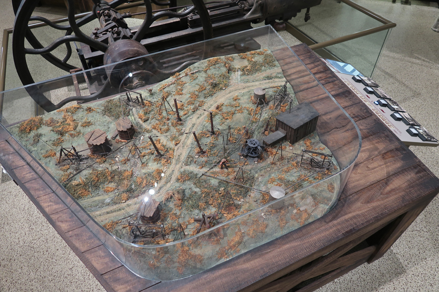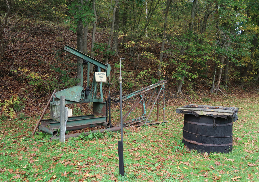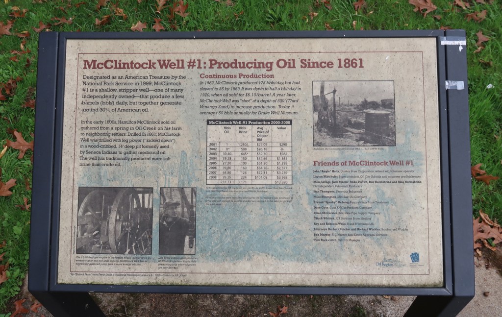 It was one of the hundreds of wells drilled along Oil Creek during the frenzy that followed the success of the Drake Well. Drilling in 1861. McClintock Well #1 initially produced 175 barrels of oil a day but was down to half a barrel a day in 1920. It is advertised as the longest producing well in the U.S (now >155-years). However, they only pump it once per year and the oil revenue is not sufficient to cover the cost of pumping – they just want to retain the record!