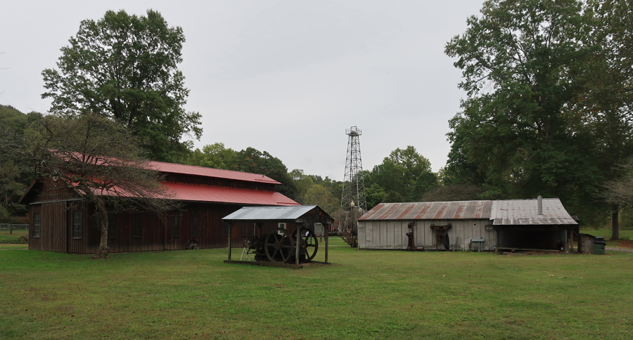 Oil Transportation Building on left, Engine House on right, and standard steel drilling rig (1920) in background.