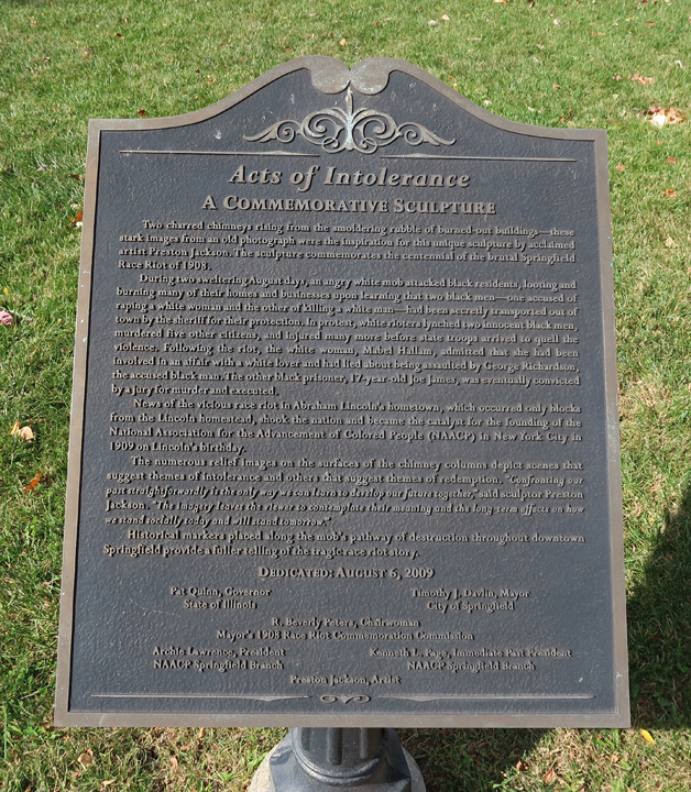 “Two charred chimneys rising from the smoldering rubble of burned-out buildings—these stark images from an old photograph were the inspiration for this unique sculpture by acclaimed artist Preston Jackson. The sculpture commemorates the centennial of the brutal Springfield Race Riot of 1908.” Enlarge sign to read about the Riot.