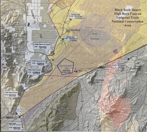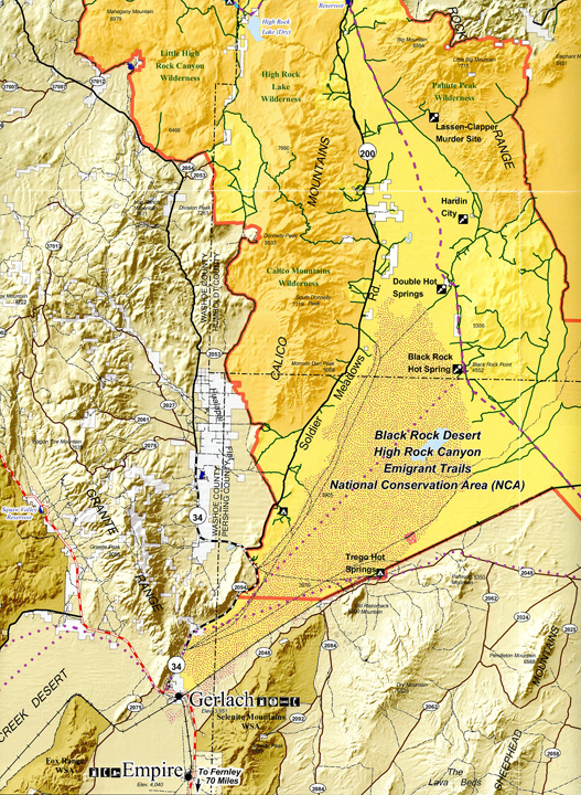 Map showing a small southern part of the Black Rock Desert – High Rok Canyon Emigrant Trails NCA