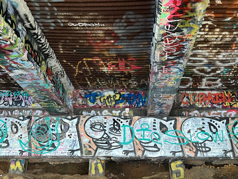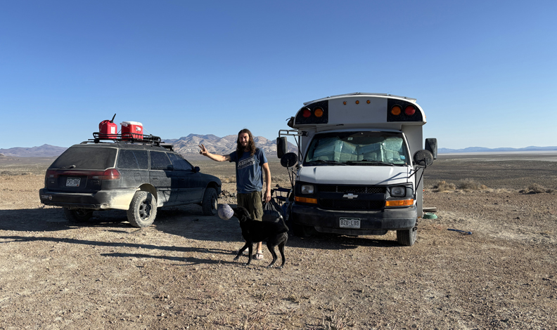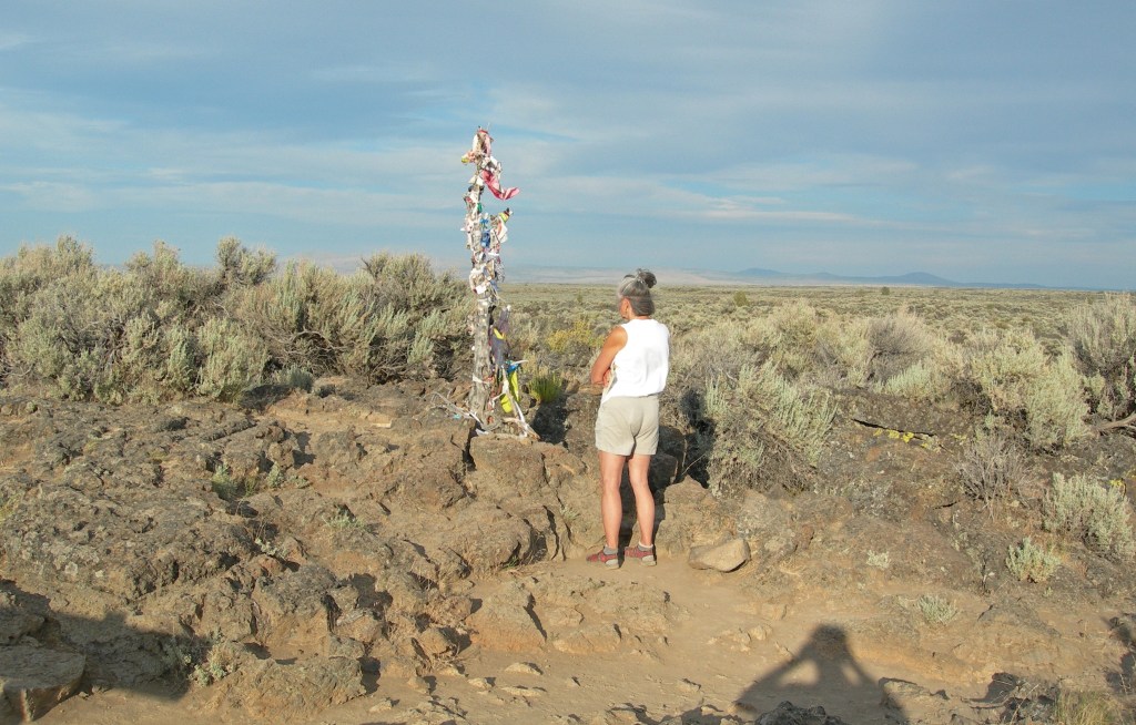 According to Wikipedia: “Burning Man is a week-long large-scale desert event focused on “community, art, self-expression, and self-reliance” held annually in the Western United States.” It started in 1986 at Baker Beach in San Francisco and moved to the Black Rock Desert in 1990. It has a tumultuous history. A symbolic man is created and burned symbolically at the end of the event. The event usually occurs around Labor Day. I met the fellow in the next photo who explained how he had worked at the event but quit because of a conflict with his boss. He cautioned me not to drive into the designated Burning Man “Black Rock City.”  He said the workers, who live there year-round, do not like others entering the area. The event had a crowd of 74,126 in 2023. Several people have died in relation to this event.