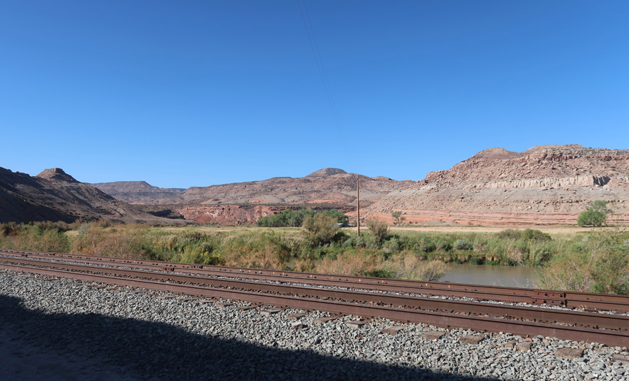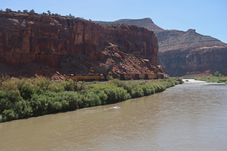 Union Pacific railroad train moving through canyon; the North Branch of the Old Spanish Trail passes through the eastern part of the NCA.