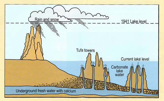 Tufas are produced as underground springs mix with the carbonate in the lake water to produce calcium carbonate.