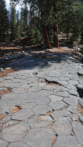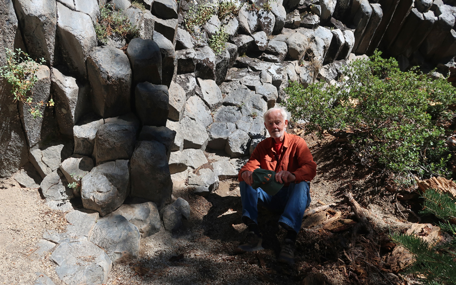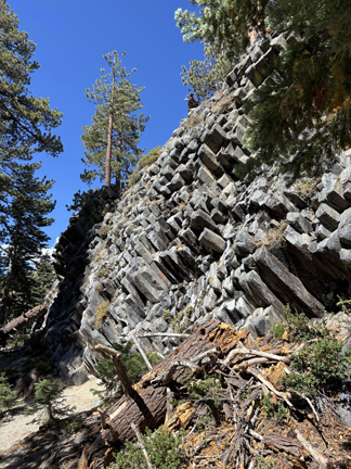 I then hiked the Devils Postpile loop Trail, about one mile. It goes up over the top and then back to the Ranger Station. As basalt lava erupts and cools, it shrinks and then cracks. Sometimes it will form vertical columns with three to seven sides.