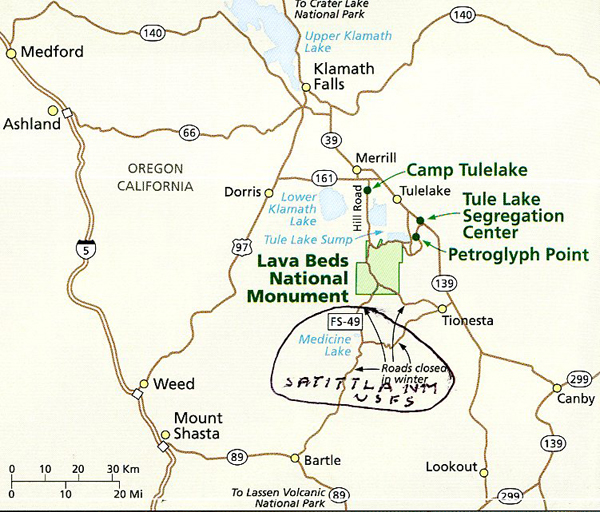 I took Rt-299 W through Alturas to Canby CA, then Rt-139 N to Tionesta, then Forest Service road FS-97 to the Volcanic Legacy Scenic Byway, then 2.6mi N on the Byway to Medicine Lake. It took a good deal of time to figure this out using at least three maps with varying route numbers.