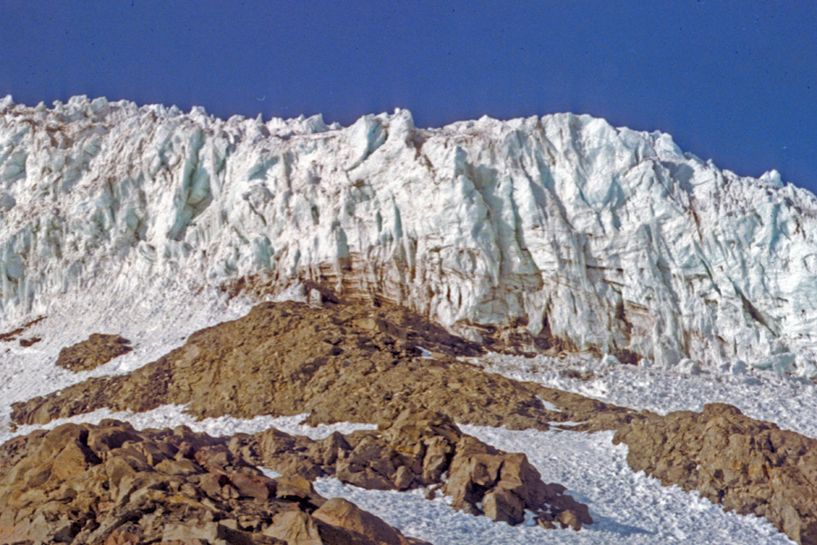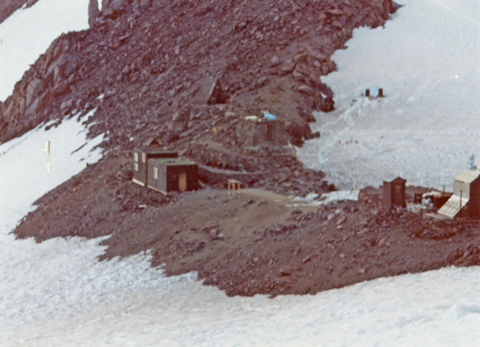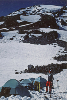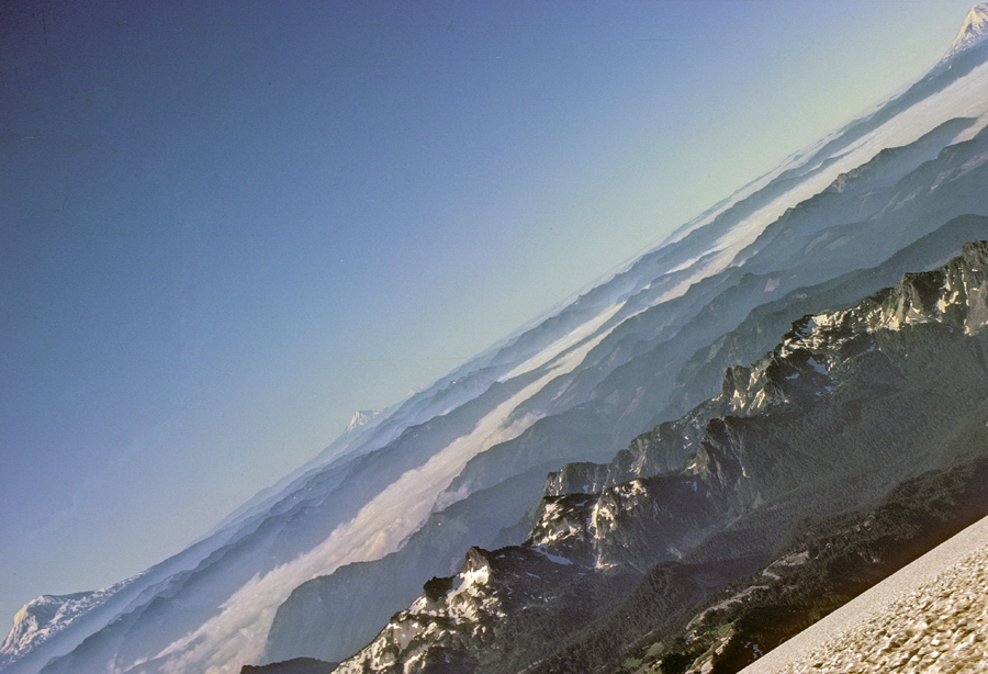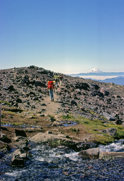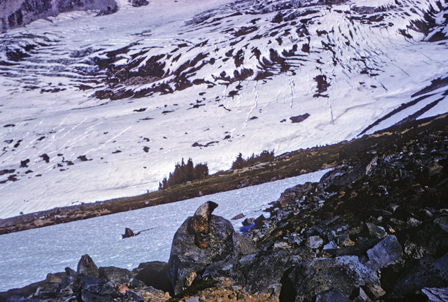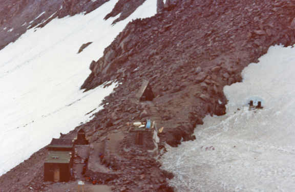 After having a problem with altitude sickness, George and I decided not to attempt the summit. We packed up after a light breakfast and headed down the mountain. This photo shows us descending through “sun cups” with Mt Adams in the background.