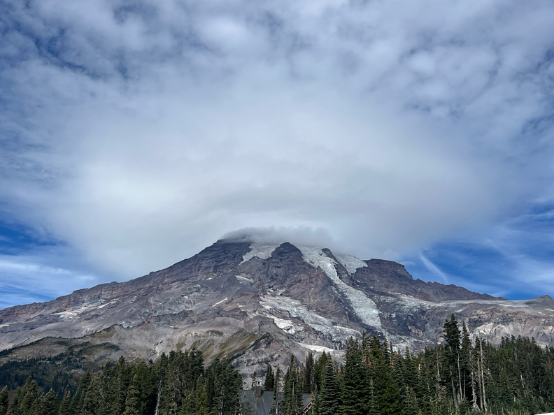 Mount Rainier covered with a lenticular cloud, indicating high winds at the top of the mountain. It is recommended that you not climb into such a cloud.