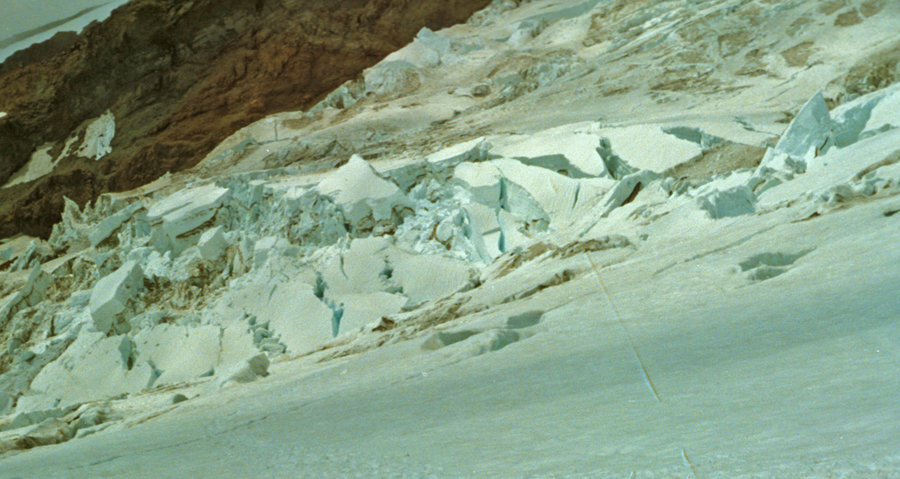 We were up at 2am to prepare for the push to the summit. We left camp at 4:15am with headlamps to light the way. The guides placed fixed ropes on a steep slope next to the icefall, and that is where the steepest climb began. Photo taken day before.
