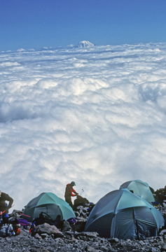 The next morning, I signed in with Rainier Mountain Guides, met my tent mates Steve and Peter, and started up the Muir Snowfield in a heavy mist and rain carrying a 50-pound backpack. I was on a five-day glacier climbing seminar.