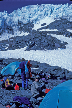 About an inch of snow fell overnight. In the morning, we had more crampon, rope, and crevasse rescue practice. At 11am, we started a strenuous climb up the Kautz Glacier. Camp 3 was on a rocky outcrop at 11,200ft.