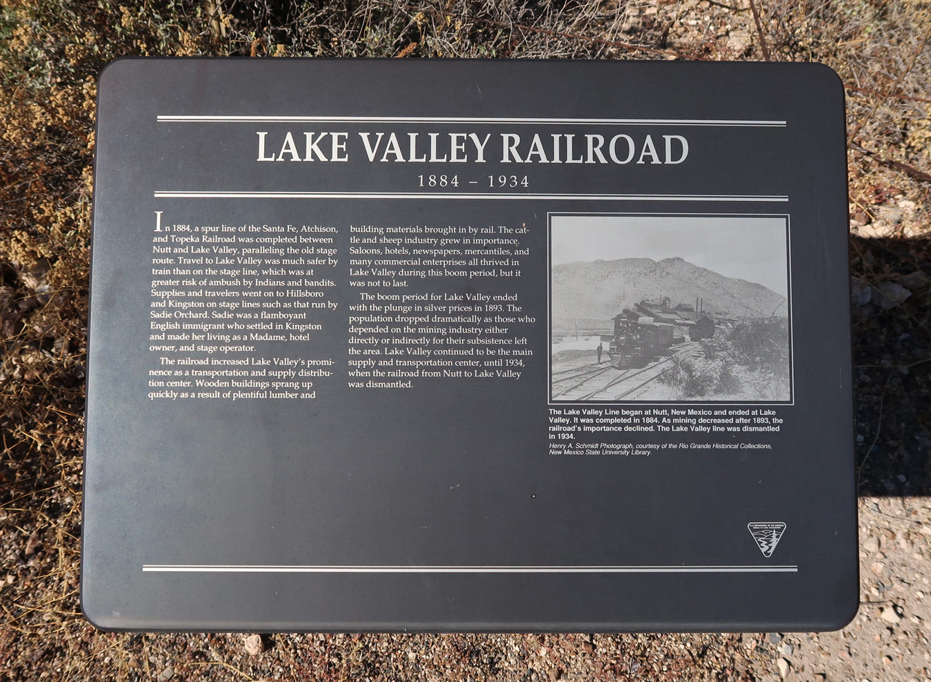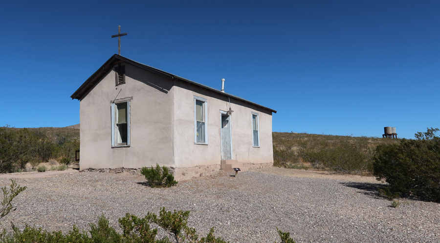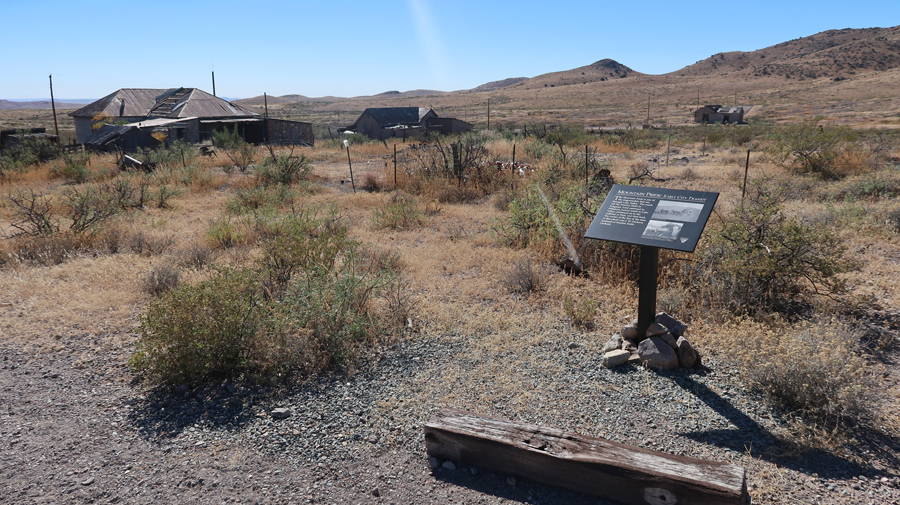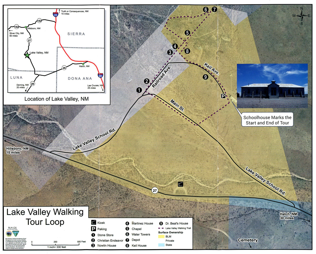 The mining town of Lake Valley was founded in 1878 after silver was discovered. It is now administered by the BLM. The restored schoolhouse provides a glimpse of what schooling in a rural area was like in the early 20th century. The Schoolhouse/Visitor Center is located in the middle of the photo, Lizard Mountain in background.