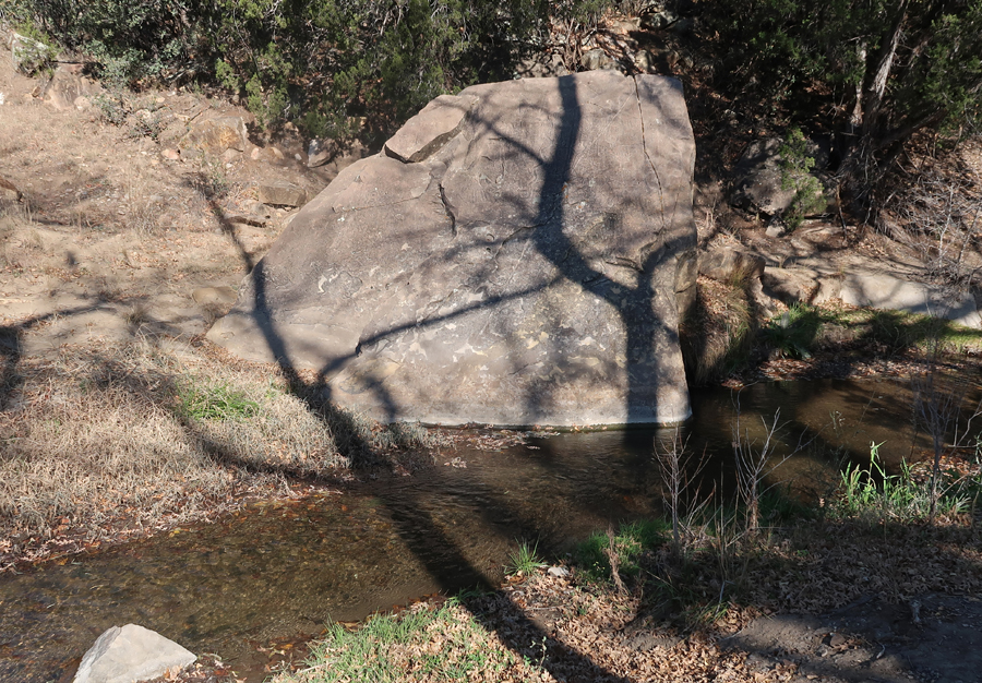 “At the midpoint is Petroglyph Rock in the riverbed (images of native Water God).” Later, a ranger at the fort told me someone had painted graffiti on the rock, and it was cleaned off but it made the “Water God” hard to see.
