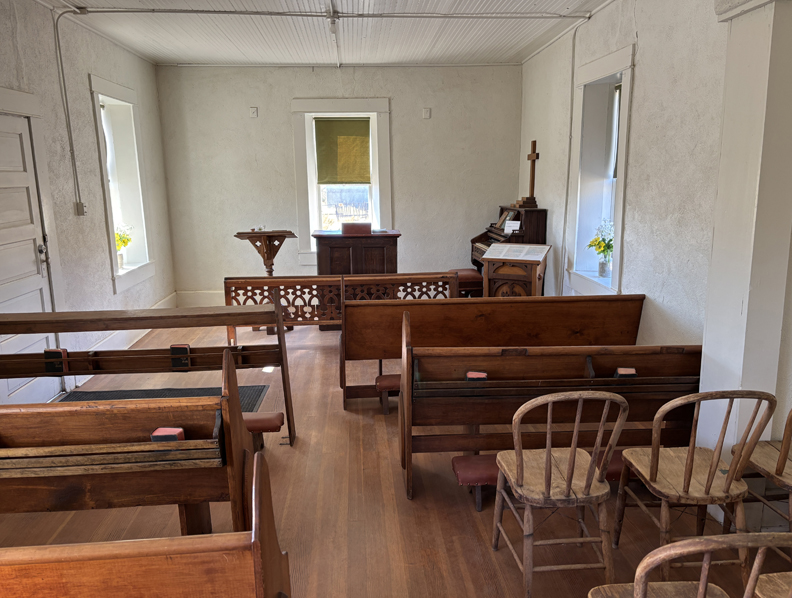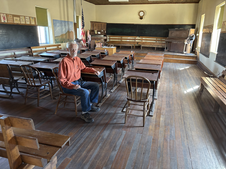 Almost overnight, the small frontier town blossomed into a major settlement with a population of 4,000 people. Today, silver mining has played out and all that remains is a ghost town. The BLM has restored the schoolhouse and chapel. Caretakers and a view inside of the “Schoolhouse” –