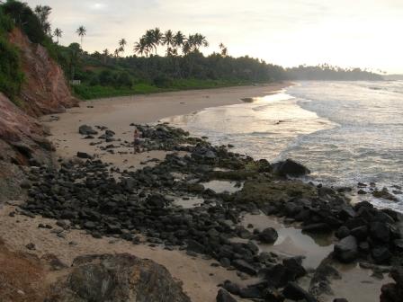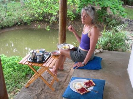 Tom and Sunny drank Arrack, the national coconut whiskey, with club soda and I sipped a beer. He brought out a lovely dish with two fish arranged with fresh tomatoes and onion rings. He also only brought out two dishes. We were ready to share one, when he gives one whole fish to Tom and the other to me. His brother-in-law and his son were sitting with us but no one else was eating!! When I finished mine, he gave me another piece of fried sear fish and then brought out another big mullet fish with the fixings and we had to try this as well. It was very good, a white firm flesh that almost reminded you of crab or lobster. By now it was nearing 9 o’clock and the table behind us was still laid out with our dinner as I suggested that we move to the table. Once again there was a banquet set out: rice, shrimp curry, fish curry, boiled vegetables, pasta fish casserole, lettuce-tomatoes-cucumber-onion salad plate, and waffles.